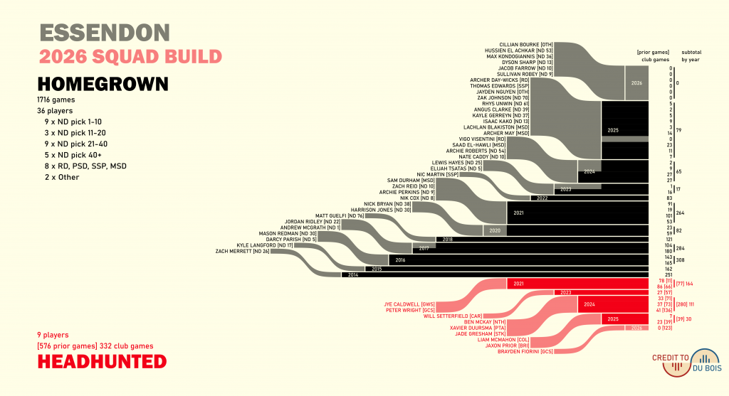 If we look at Essendon’s list build chart (each team covered in Round 0’s edition of TWIF) we can see why. Nic Martin (Supplementary selection period), Elijah Tsatas (Pick 5) and Lewis Hayes (Pick 25) are the only players still on Essendon’s list from the 2021 and 2022 draft periods.