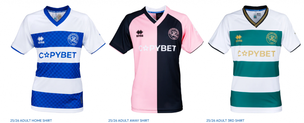 A great example is this three-kit setup from the Queens Park Rangers that I stumbled upon recently that they have as their standard issue uniforms for the 2025/26 Championship in England. There is almost certainly no team whose kit would clash with all three of these shirts, meaning there would be no risk of a clash regardless of opponent.