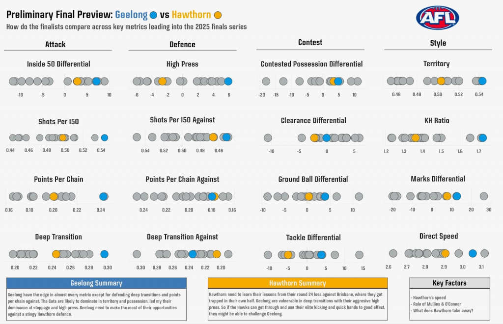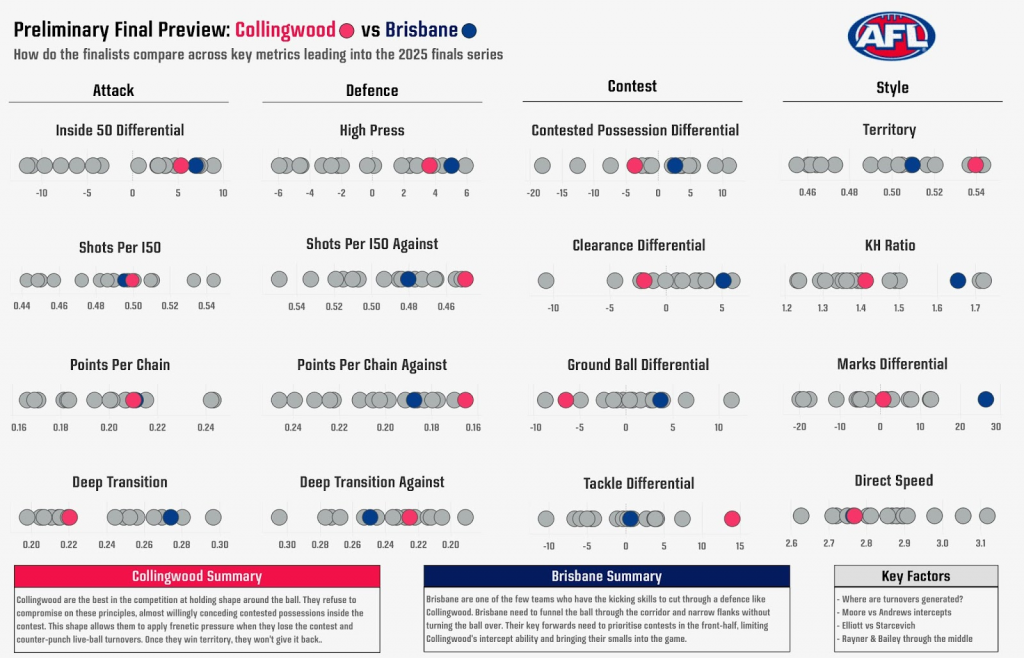 Similarities present themselves between the two sides. Both have a kick preference, and work best in the kick-mark game. Both press high for intercepts, and like to try to dominate territory to instead of maximizing efficiency.