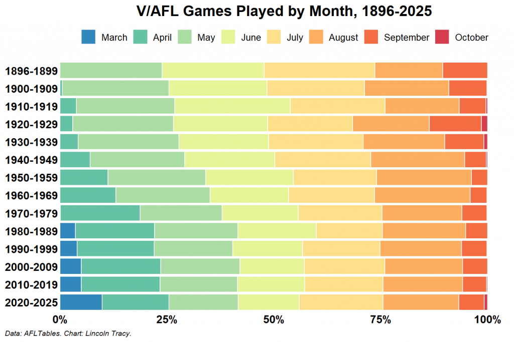 We can see from the figure above that May through to August have hosted the majority of V/AFL matches over the life of the league. The season started in late April or early May from 1896 through to the 1950s. But clearly not satisfied with this four-month window, the start of the season started creeping earlier and earlier in the year shortly after that.