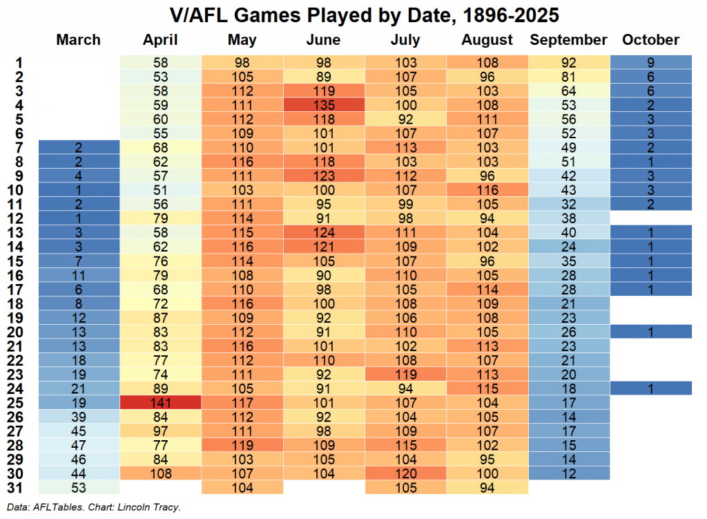 The previous earliest day was March 7 in 2024 and 2025, when the Swans played Melbourne and Hawthorn, respectively. The old record would have been March 6, had Cyclone Alfred not forced last year’s match between the Brisbane Lions and Geelong to be postponed to Round 23.Provided there are no unforeseen interruptions for the Swans/Blues and Gold Coast/Geelong games over the next two days (note: I wrote this before I saw reports of another topical cyclone heading towards Brisbane and the Gold Coast), we can now say that 228 different days of the year – ranging from March 5 to October 24 – have seen at least one game of football over the years. April 25 has seen more games of football than any other day on the calendar (141, which will jump to 145 after the four Round 7 games next month).